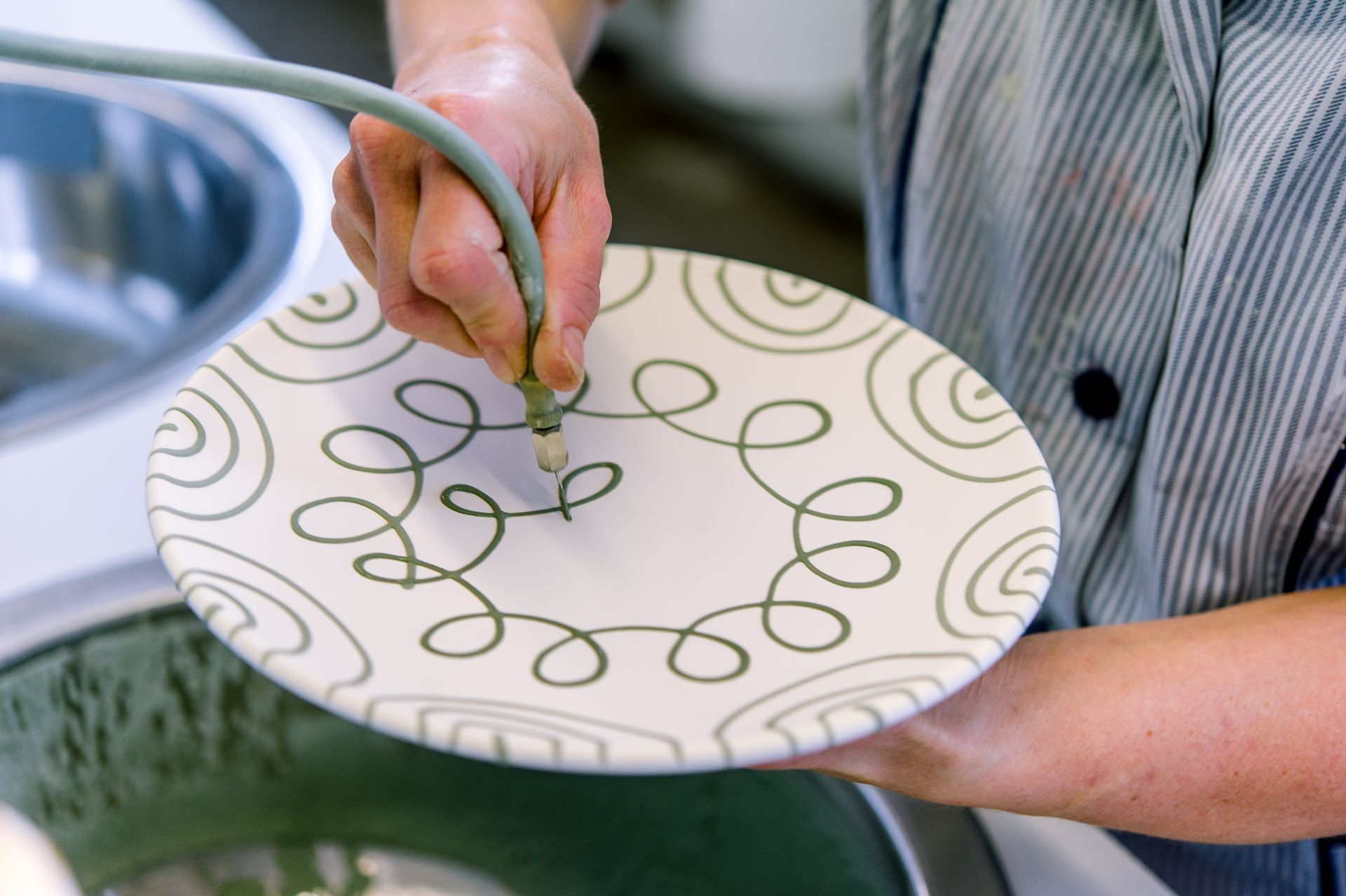 And then: the flames. In 2021, the technique of ceramic flaming was declared a UNESCO Intangible Cultural Heritage. It takes two years to learn. Painters use a spraying technique to apply loops, strokes, and arches in precise patterns. Each item in the range has a specific number of marks that must be honored. The green appears soft and muted before firing. Only heat reveals its true vibrancy.