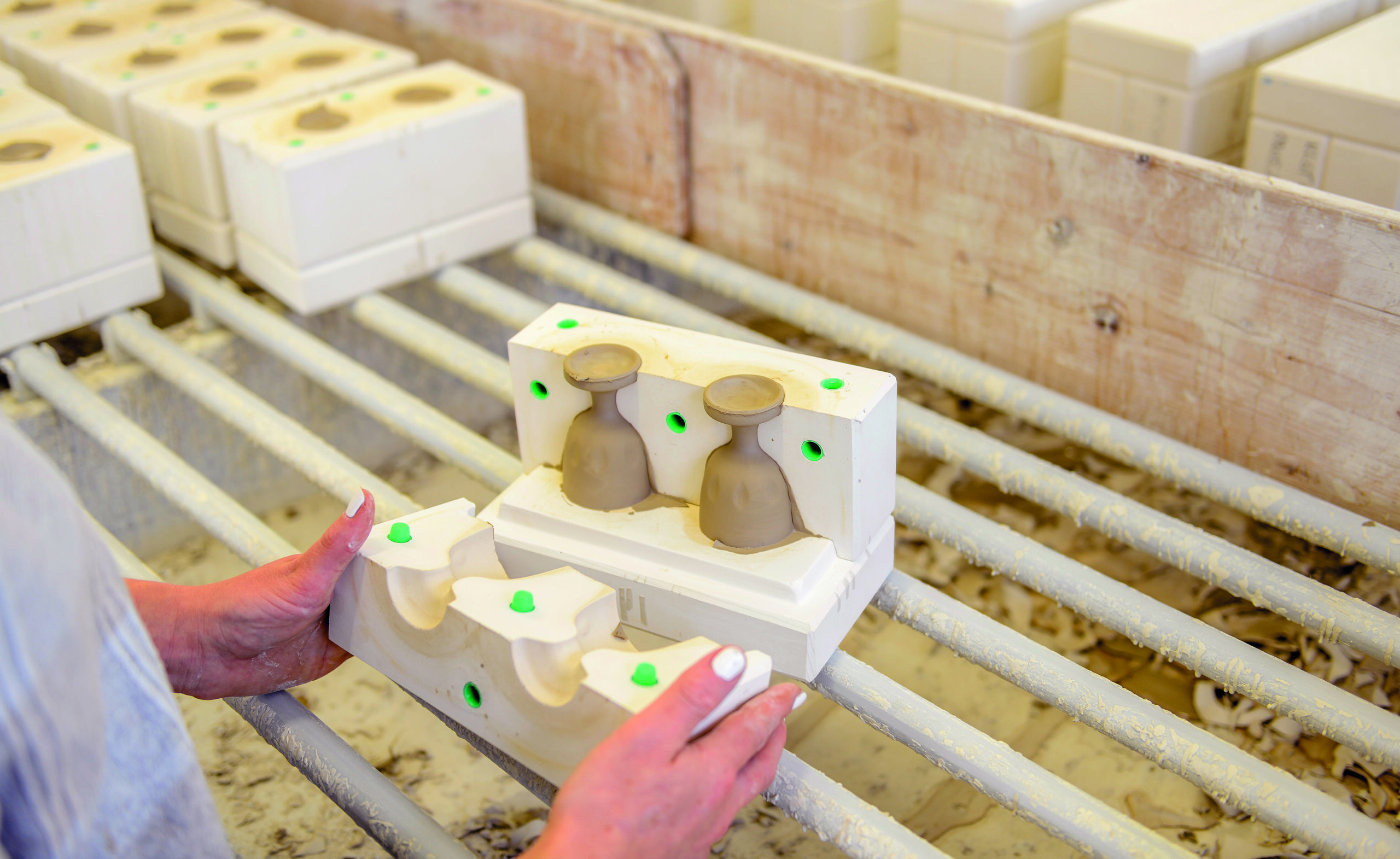 Every mold is developed in-house. In the foundry, liquid slip is poured into plaster molds that draw out the moisture, forming clay walls along the mold’s interior. A water jug rests in its mold for an hour before the excess slip is tipped out. Plates, cups, and bowls are turned on a wheel. A rod of clay is sliced, then pressed and shaped into round forms. Angular pieces, like star-shaped bowls, are hand-pressed in molds.